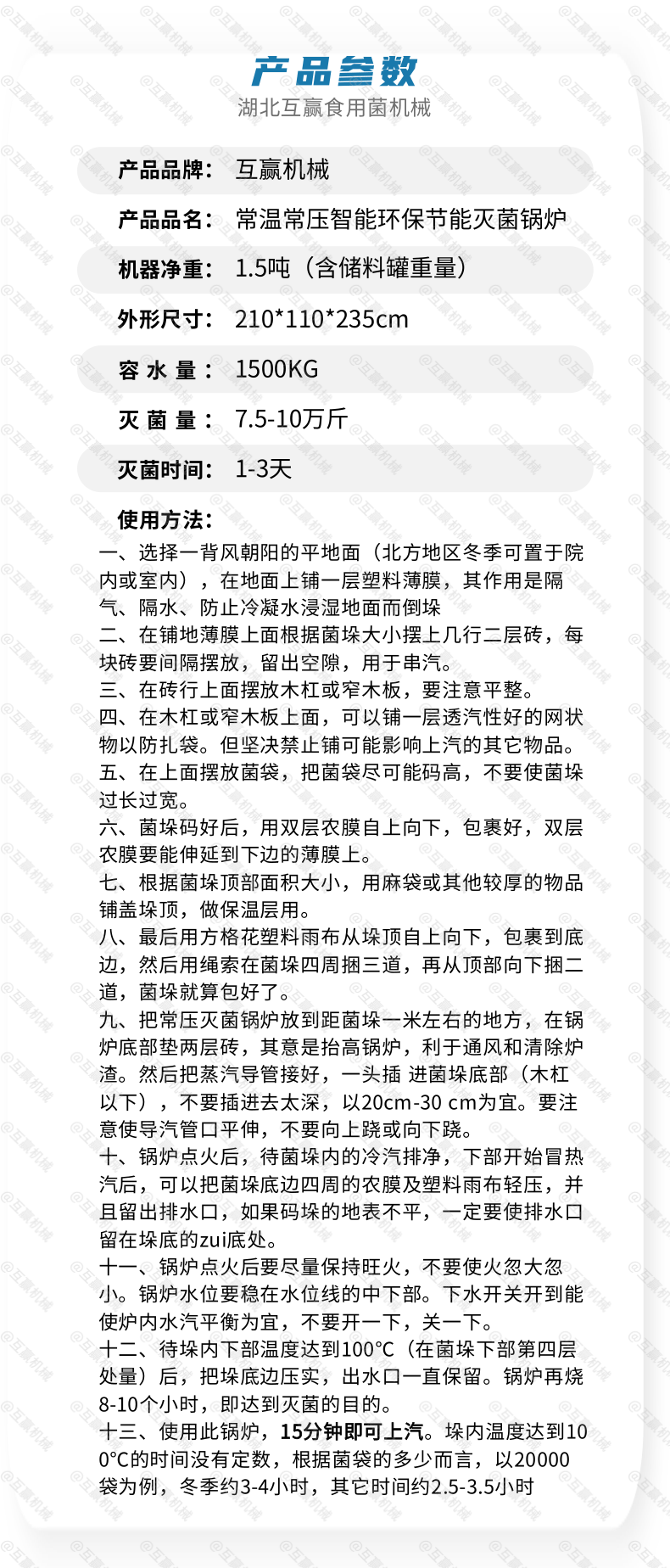 食用菌生產(chǎn)機(jī)械化技術(shù)的主要內(nèi)容是以樹枝、修剪條、鋸木屑和刨花、玉米芯、玉米稈、麥秸、稻草、花生殼、棉籽殼等為主要原料,經(jīng)機(jī)械加工成碎屑狀,添加一定的輔助材料,如麥麩、米糠、豆餅、花生餅、蔗糖、石膏、碳酸鈣、硫酸鎂等,經(jīng)機(jī)械制種、制袋、滅菌、接種、栽培、采收、加工,形成一整套機(jī)械化生產(chǎn)和栽培的技術(shù)規(guī)范。 食用菌常壓滅菌爐滅菌工藝。滅菌工藝一般分高壓滅菌和常壓滅菌。高壓滅菌主要用于制作母種、原種...